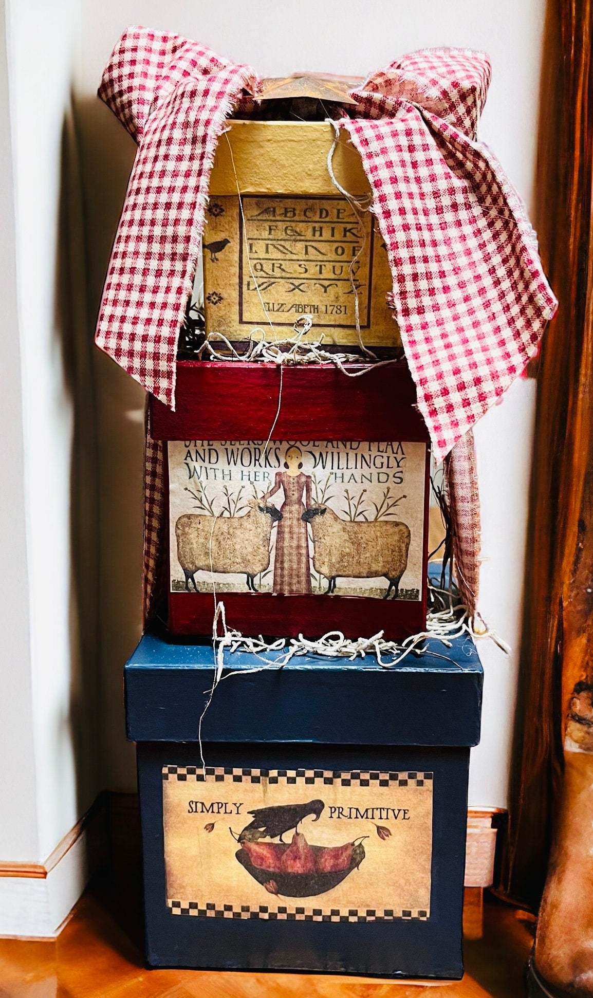 Handcrafted Primitive Americana Paper Mache Box Stack - Set of 3 | Rustic square distressed nesting boxes, Country farmhouse home decor